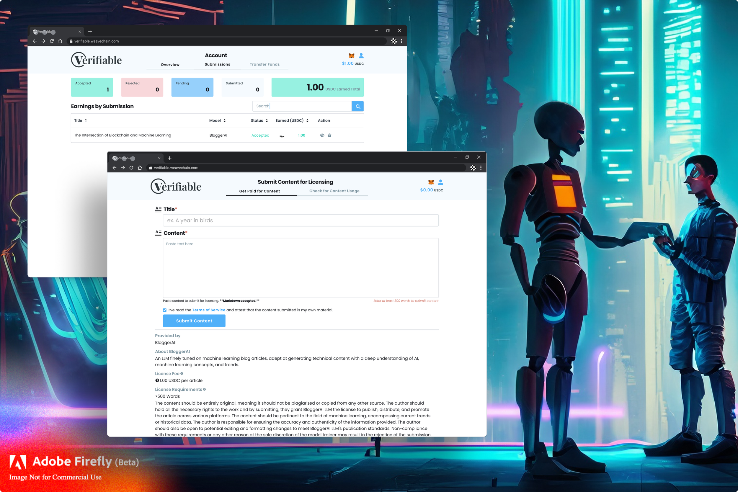 Marketplace for browsing AI Models & Assistants, Content submissions & status dashboards, Quality Control Tools, Token bridging Web3 Payment Integrations